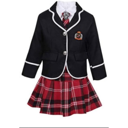 Uniforma școlară compusa din sacou, fustă, camașă și cravată.